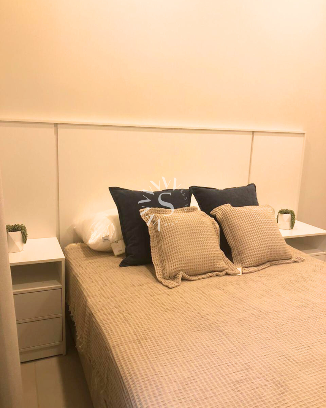 • Dormitorio equipado con cabecera y cama, placard de 2 puertas y aire acondicionado.