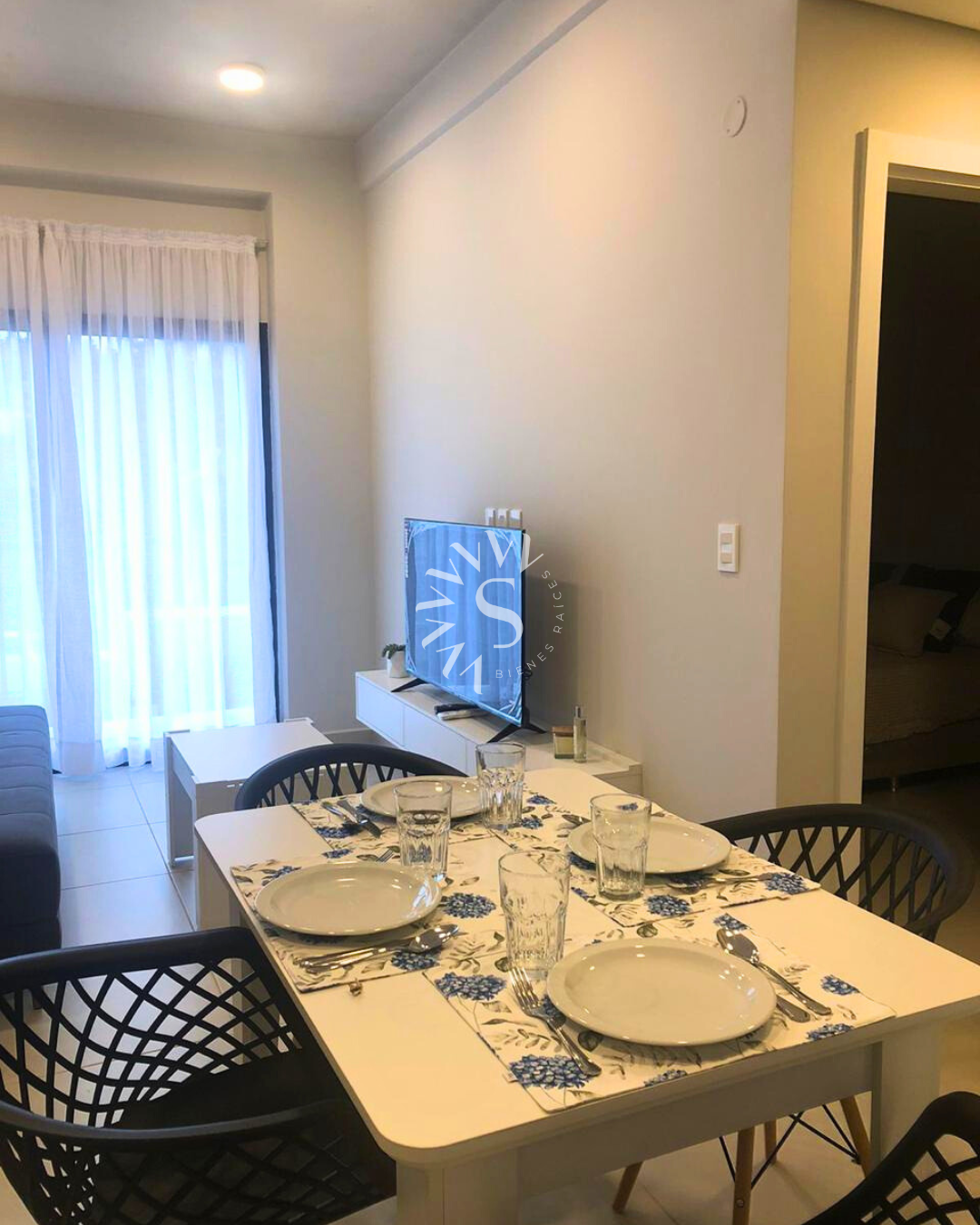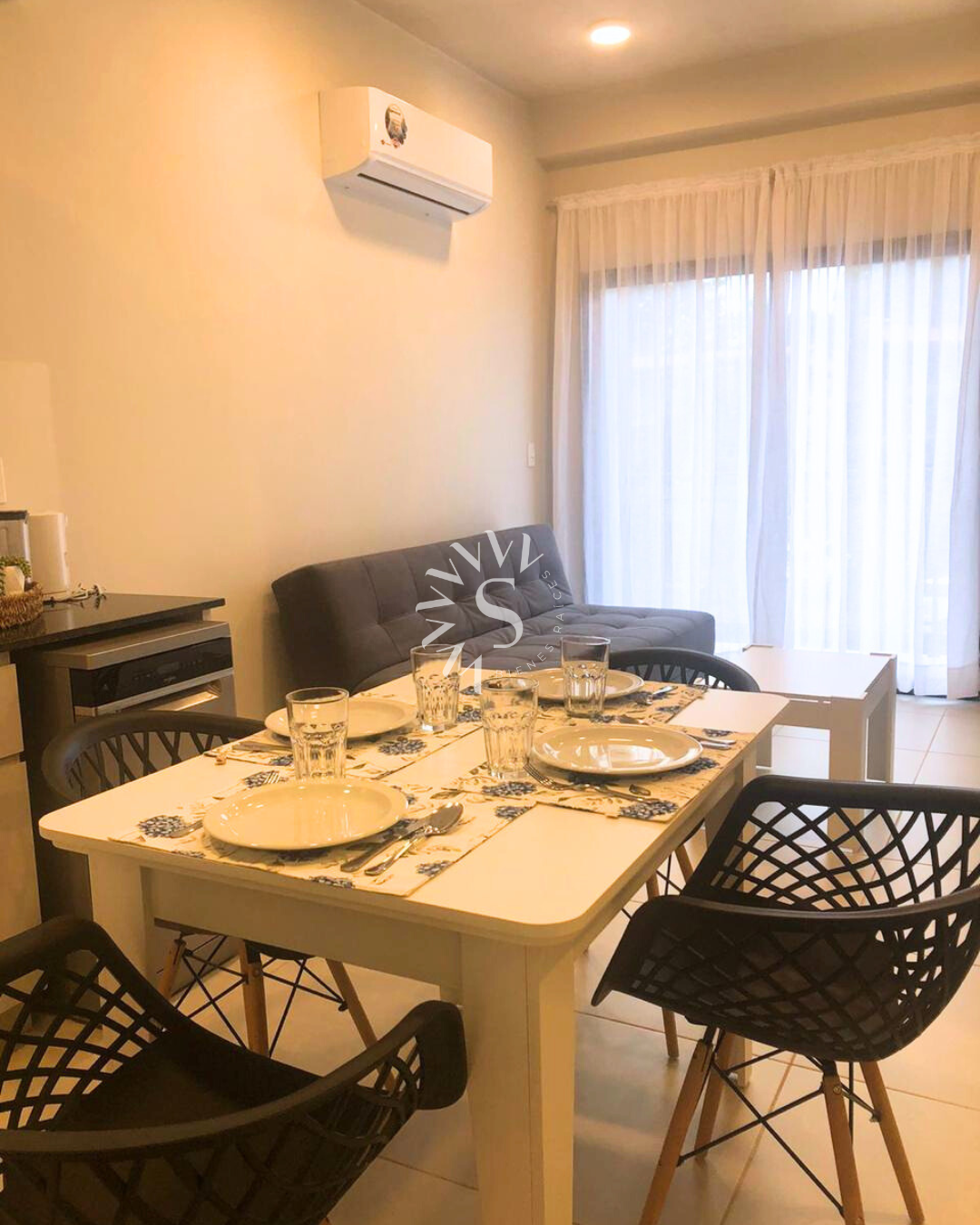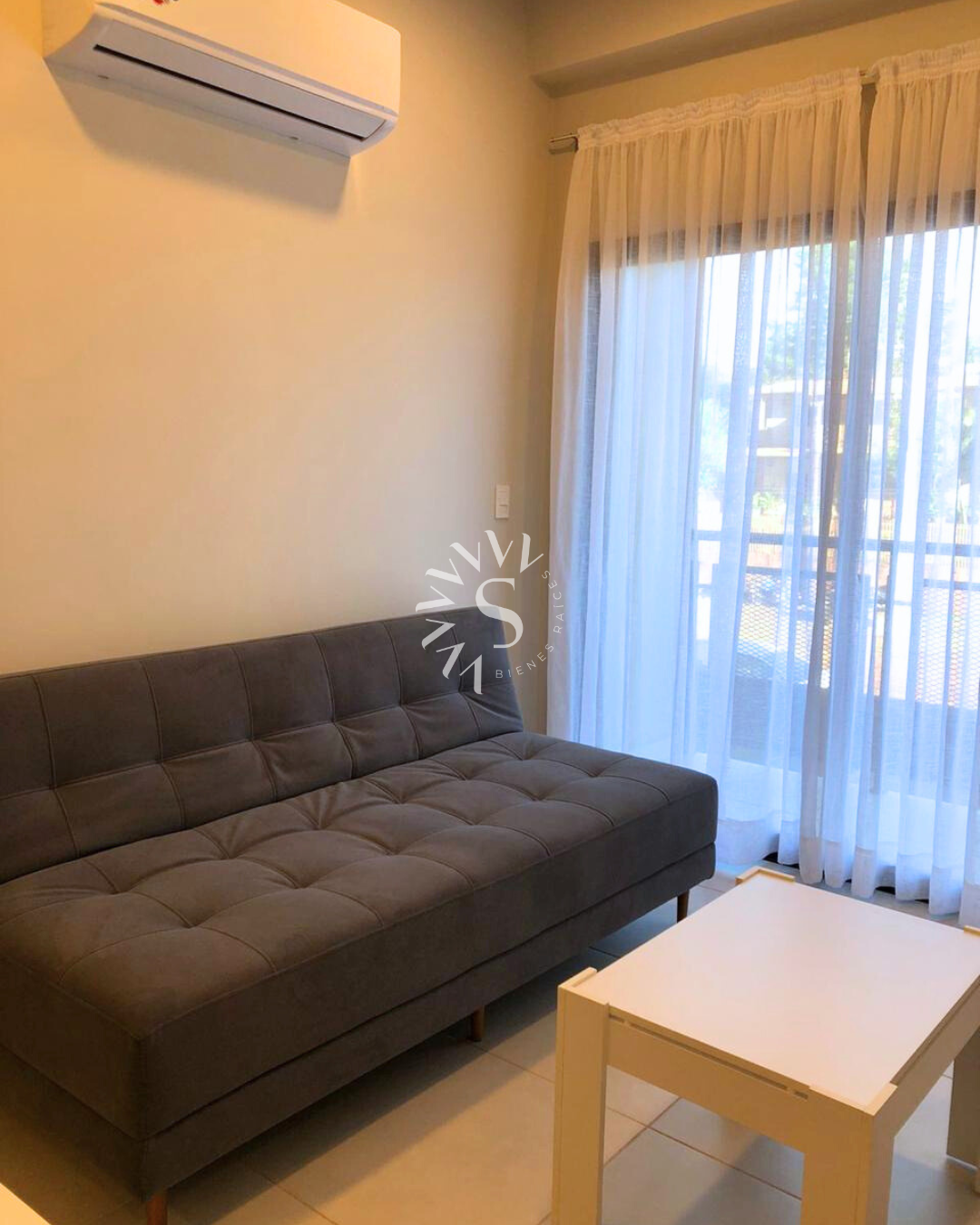 • Sala de estar amoblada con sofá, mesa ratona, tv, aire acondicionado