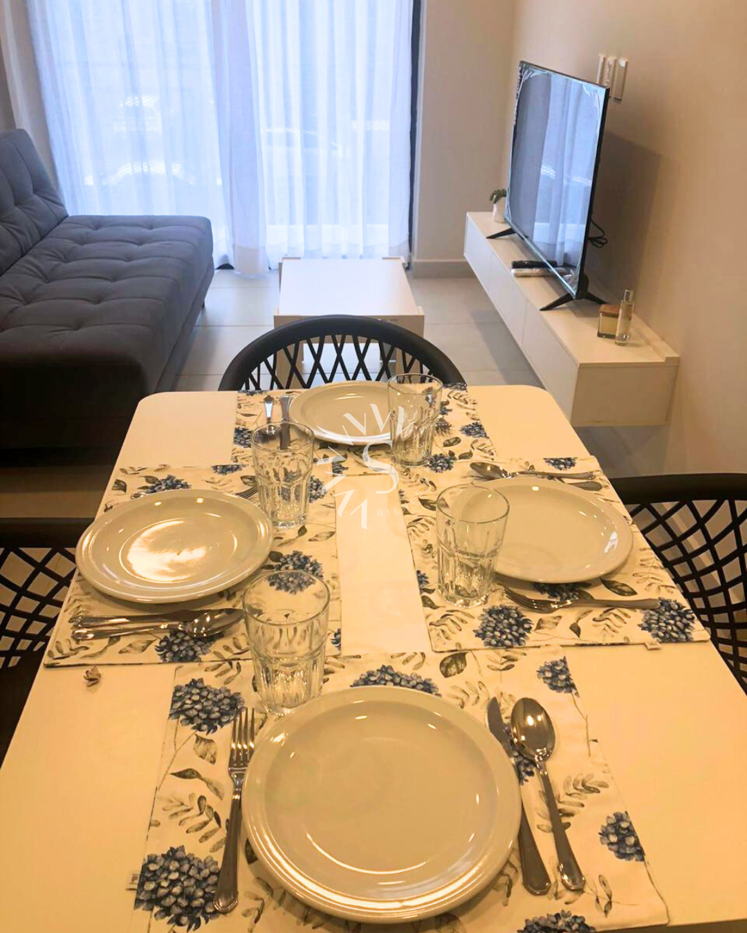 • Cocina equipada con muebles, heladera, cocina, microondas, lavavajillas, juego me mesa y sillas, cubiertos, platos.