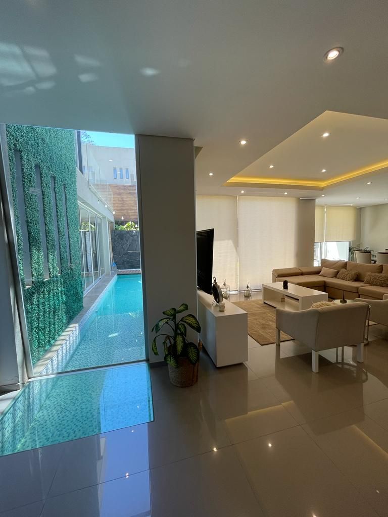 Hall de ingreso con piso de vidrio: Un recibidor impresionante que incluye piscina interior y cascada. Un diseño único que conecta lo exterior con lo interior de la casa.