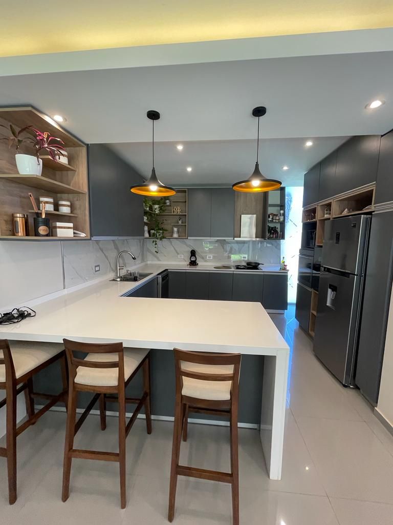 ? Living-comedor-cocina integrados: Espacios amplios y luminosos que permiten una circulación cómoda. La cocina con isla y desayunador para 4 personas ofrece un lugar perfecto para disfrutar de las comidas en familia.
